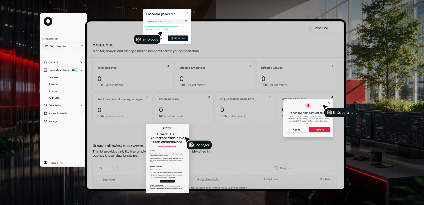 Most organisations only discover a breach after the damage is done. Uniqkey flips that. With continuous monitoring, a consolidated breach dashboard, and direct employee notifications, your IT team can move from detection to resolution without losing track of what happened, when, and by whom.