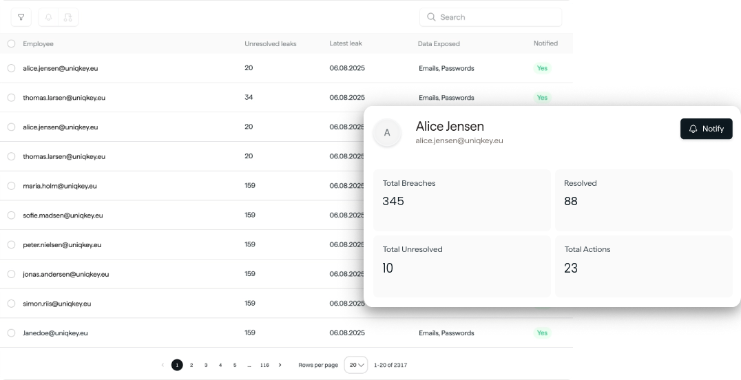 When employee credentials appear in a known data breach, every minute counts. Uniqkey monitors for compromised logins across your organisation, gives IT teams instant visibility, and enables swift, structured response, so threats are contained before they become incidents.