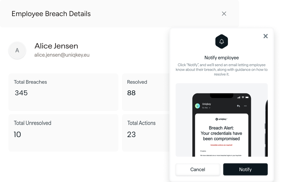 Uniqkey alerts your team the moment compromised credentials are detected, so response begins before attackers have a chance to act.