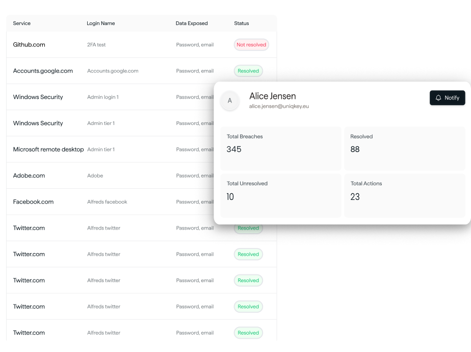 Uniqkey works with an EU based breach intelligence provider and our proprietary technology that keeps track of known breach databases. If employee credentials show up, your team is alerted right away. Passwords are never shared in plain text. Only salted hashes are used for matching.