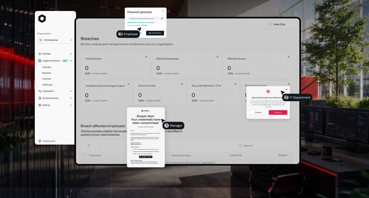 Most organisations only discover a breach after the damage is done. Uniqkey flips that. With continuous monitoring, a consolidated breach dashboard, and direct employee notifications, your IT team can move from detection to resolution without losing track of what happened, when, and by whom.